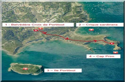 Nous sortons depuis le point de vue de la Croix du Portixol. Au croisement des sentiers nous tournons sur la gauche, en direction du Cap Prim. Nous descendons par le sentier et nous arrivons, après quelques marches, à une barrière de bois qui nous ferme le passage vers un petit ravin.