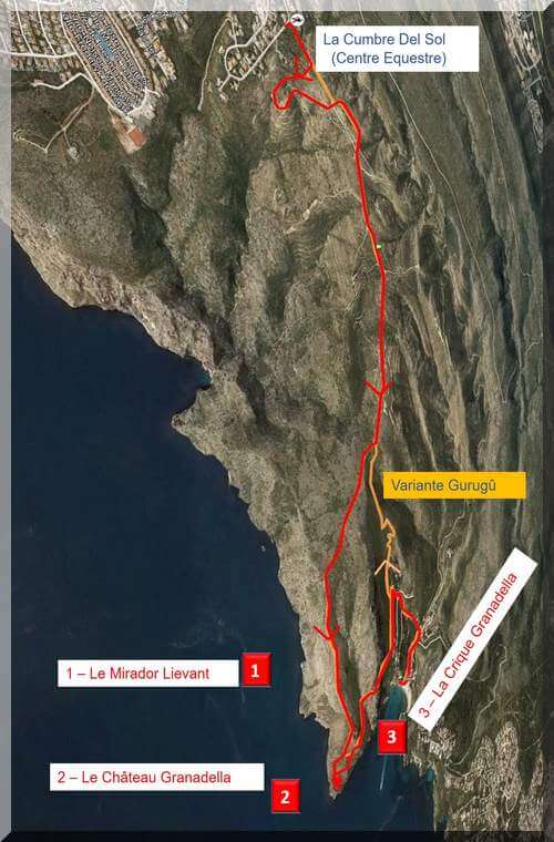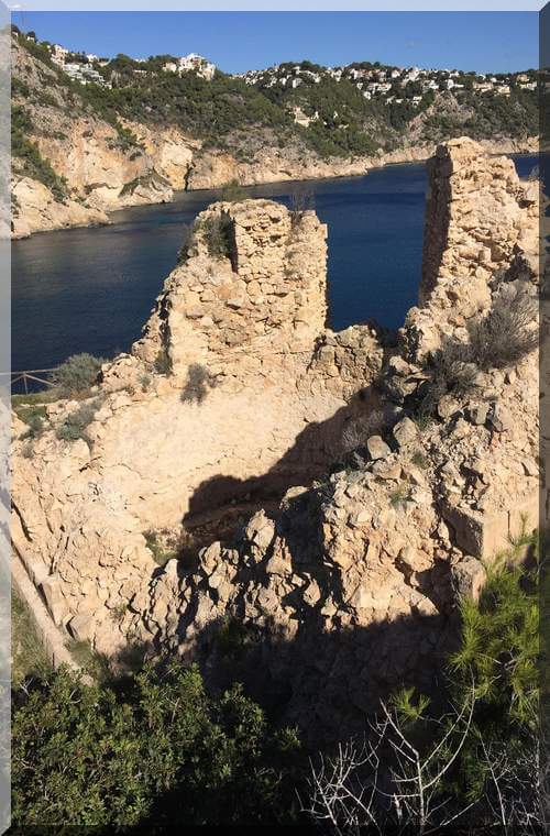 Vous continuerez votre chemin en laissant sur votre gauche le ravin du Barranc de Martorell, un ravin qu'il faudra traverser plus tard pour revenir au point de départ et suivre le long de chemin de terre qui devient ensuite un sentier, vous atteindrez les falaises, pour trouver le Mirador de Llevant et continuer par une descente raide jusqu'aux restes de l'ancien Castell de Granadella, un château en forme de fer à cheval dont il ne reste que peu de choses, apparemment détruit pendant la guerre napoléonienne lorsqu'il fut bombardé par les navires anglais.