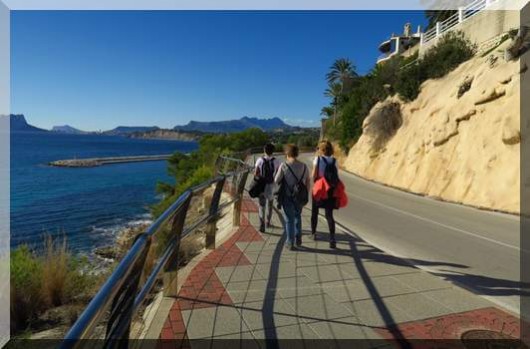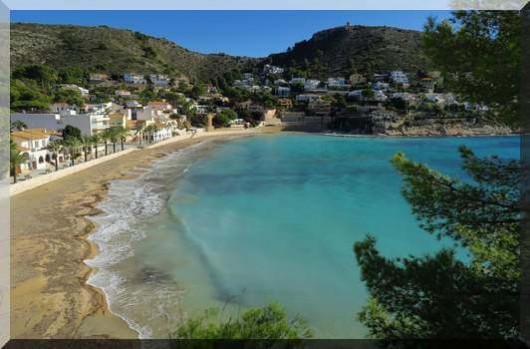 Le port de moraira, la promenade le long de la rade, le cap de moraira avec la tour du cap d'Or et la grotte de la Cendra.
