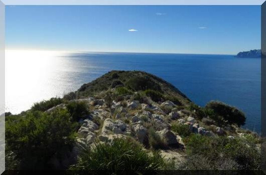 Votre descente, d'abord en direction de la pointe des falaises, vous mènera à une petite tour de guet pour prendre quelques photos, demi-tour pour approcher une vieille citerne, (citerne rectangulaire et voûtée intérieure qui servait à alimenter en eau les soldats chargés de surveiller la côte), Une fois au carrefour de la grotte, continuez votre descente pour jeter un coup d'oeil sur la grotte et son panneau d’informations, (La Cova de la Cendra est le site archéologique le plus connu de Teulada avec la plus longue histoire d'investigation).