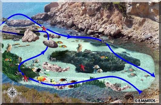 Le parcours se rapproche de la paroi de la crique, nous nous en séparons et observons les grandes pierres qui tachent le fond, et dont les cavités sont un refuge pour les espèces telles que le poulpe.