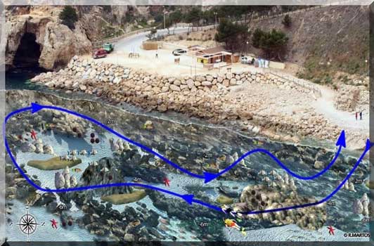 À côté de l'ilot, vous en trouverez un autre ne dépassant pas plus de 50 centimètres au-dessus de l'eau, et qui plonge jusqu'à - 4 mètres. Il est intéressant, si la mer est calme, de passer entre les deux, dans une sorte de brèche d'environ 10 mètres de long. Vous pourrez ensuite faire le tour du grand ilot et vous verrez une prairie touffue de posi donies, et plus loin un passage peu profond près de la pointe de la crique. Ici, les roches apparaissent à nouveau avec les milliers d'ouvertures et cachettes que la vie abondante marine colonise.