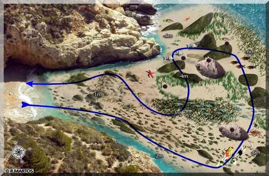 En arrivant à l'extrémité sud du brise-lames, où disparaissent les blocs rocheux et commence la paroi immergée des arcs du Moraig vous pourrez changer de cap, mais il est déconseillé de traverser la paroi qui conduit à l'intérieur de la grotte, car elle est très peu profonde et vous pourriez vous blesser.